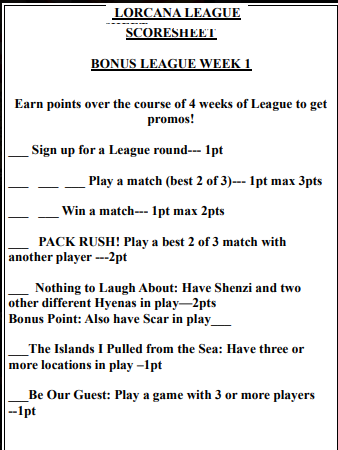 Prior to Lorcana’s set 9 (Fabled) releasing, Lorcana weeklies had a point a system. Each week, you could show up, earn points for doing a variety of different things, and at the end of the season, the folks with the most points got some special prizes.