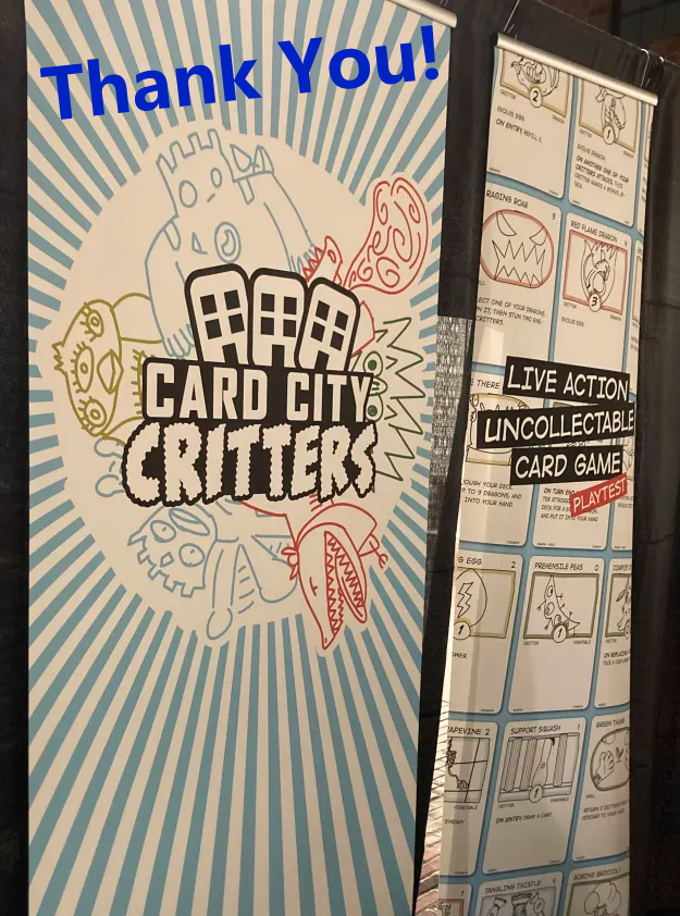Thank you to our friends Lucas, Sukie, and Tyler who helped us run Card City Critters. Without your help as NPCs, hiding cards, repacking decks, and doing booth setup and breakdown, none of this would have been remotely possible.