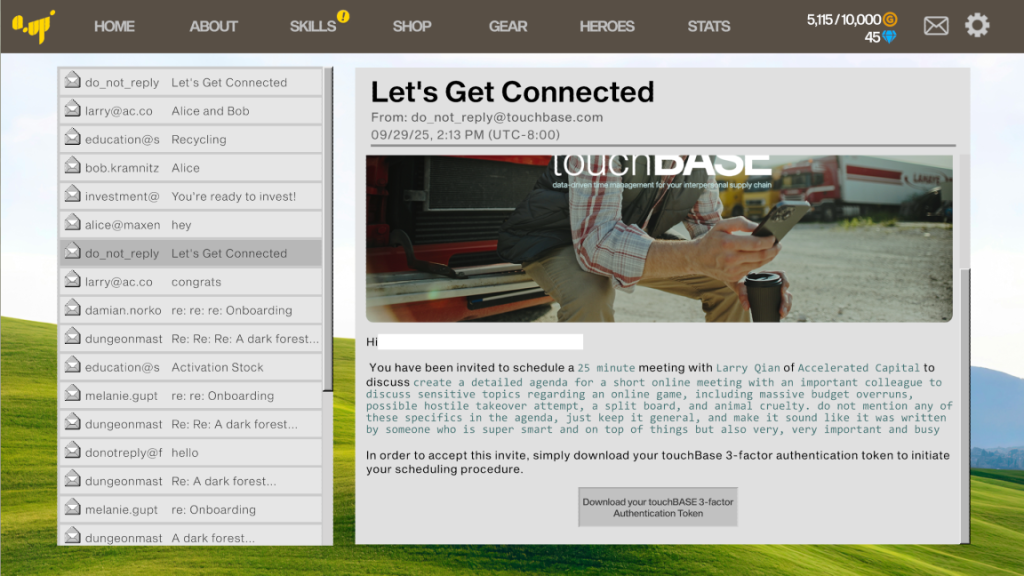 Of course, the faux esport/live service game feels like it’s just the tip of the iceberg in a sense. There’s also an in-game mail client where as you play, you end up somewhat accidentally agreeing to “work” for the fictional company making the game in question. I don’t think I can spoil too much from the demo, but even what I saw there seemed to get really weird quite fast, with a weird sci-fi narrative around corporate sabotage.
