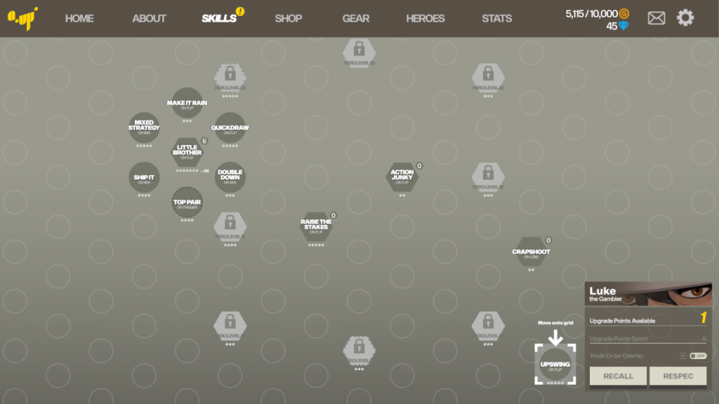 Oh, and I haven’t even talked about the gameplay! Because yes, there is gameplay. It’s not just a coin-flipper. Instead, fairly early on, you unlock a node based skill grid, different for each of the available characters. This grid is a set of triggers and chaining activation, and by moving nodes around, you can build sets of synergies to make it so that even when you lose, you still win!