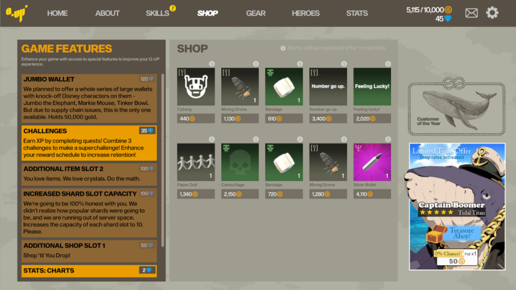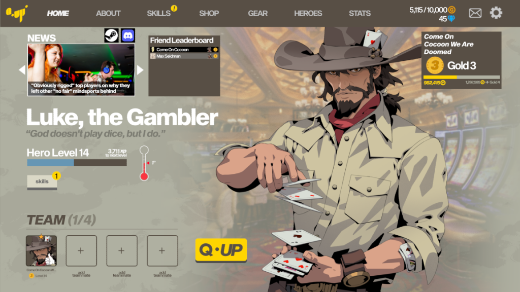 Q-Up, like Unfair Flips, is a game about coin flips. But unlike Unfair Flips, it’s not really about flipping coins. Instead, it seems to be a weird satire on live service games at every level, from the design, the development, and the weird nature of E-Sports.